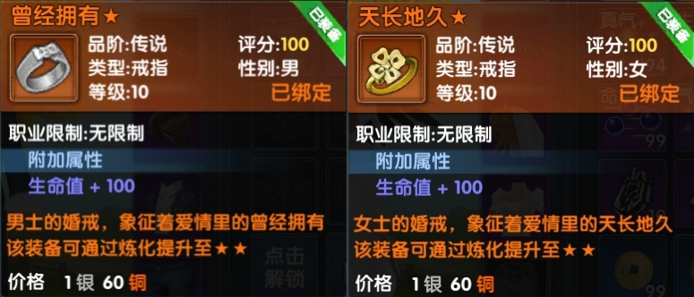 3、最后就是爱情的象征“戒指”,男方获得“曾经拥有”,女方获得“天长地久”,均可增加100点生命值。