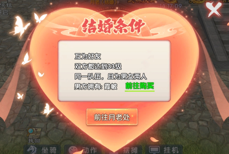2、组队中队长可对月老发起申请,另一人同意后即可成亲。